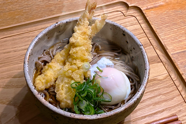 温かいかけそばに、海老天、温泉卵、刻みネギを乗せた一杯。